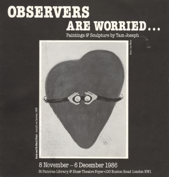 The above extracts are from an Introduction by Eddie Chambers in Observers Are Worried: Paintings & Sculpture by Tam Joseph brochure. Exhibition held at St Pancras Library & Shaw Theatre Foyer, 8 November – 6 December 1986