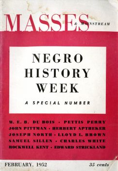 Masses & Mainstream, was a New York-based journal, published from 1948 to 1963, and was an American Marxist monthly publication. It resulted from a merger between New Masses, which ceased publication in January 1948, and Mainstream, a Communist cultural quarterly established the previous year. Charles White contributed illustrations to a number of the covers of Masses & Mainstream and the journal published a set of White’s prints in 1953. This particular issue, February 1952, dedicated to Negro History Week, included on its cover the name of Charles White among its contributors. White contributed two full page reproductions, Frederick Douglass, on page 18 and Gideon, on page 49. Both works had been made the previous year, in 1951. Gideon was lithograph on cream wove paper, 565 x 375 mm; 22 1/4x14 3/4 inches, and Frederick Douglass was lithograph on maraiz paper, 22 3/4 x 16 1/2 in. Apart from the titles of the two pieces, no further details of Gideon or Frederick Douglass are included in the issue.