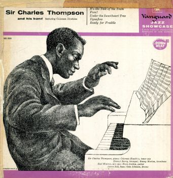 Around 1955, Charles White provided an illustration for the cover of Sir Charles Thompson and his band featuring Coleman Hawkins. The record was released on the Vanguard label as part of its Vanguard Jazz Showcase – VRS-8009. Again, it was a 10" mono recording. The cover of Sir Charles Thompson and his band featuring Coleman Hawkins featured a drawing of an animated piano player.